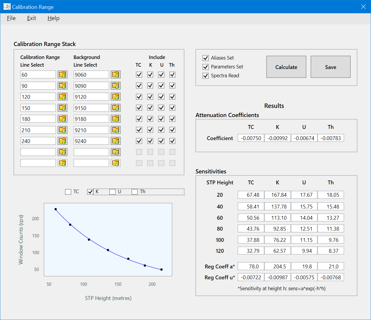 The Height Attenuation Coefficients and Sensitivities (Calibration Range) tool processes data acquired over a calibration range. The calibration range is flown at various heights – typically between 40 m and 200 m. Each line over the calibration range has an associated background line that was flown at the same height over water nearby. The background-corrected window counts are fit to the acquisition heights using an exponential regression to estimate height attenuation coefficients. Sensitivities are derived by comparing the fully-corrected window counts to the known average concentrations of the calibration range. To use this tool: