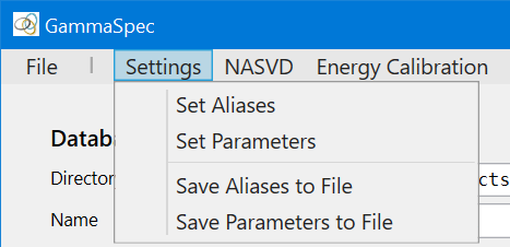 The Settings menu is used to set aliases and parameters. Aliases are the names that GammaSpec uses to access database fields. Parameters are the processing and control constants used by GammaSpec tools. Once these have been set, they can be saved to aliases/parameter control files for rapid loading during subsequent GammaSpec sessions that use the same database.