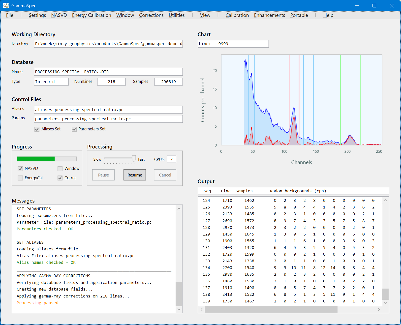 - Processing: The speed of processing can be adjusted using the slider control. Processing can also be paused, resumed or cancelled. The user can set the maximum number of CPU's that GammaSpec may use in the CPU's text box. The number must be between 1 and one less than the number of CPU's that the computer has. That is, at least one CPU is always reserved for other computer work. Set the number of CPU's to 1 if you wish to slow down the processing and pause at a particular line.